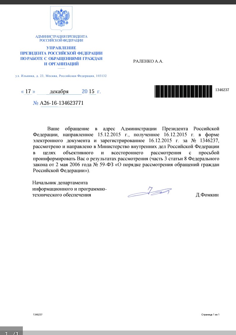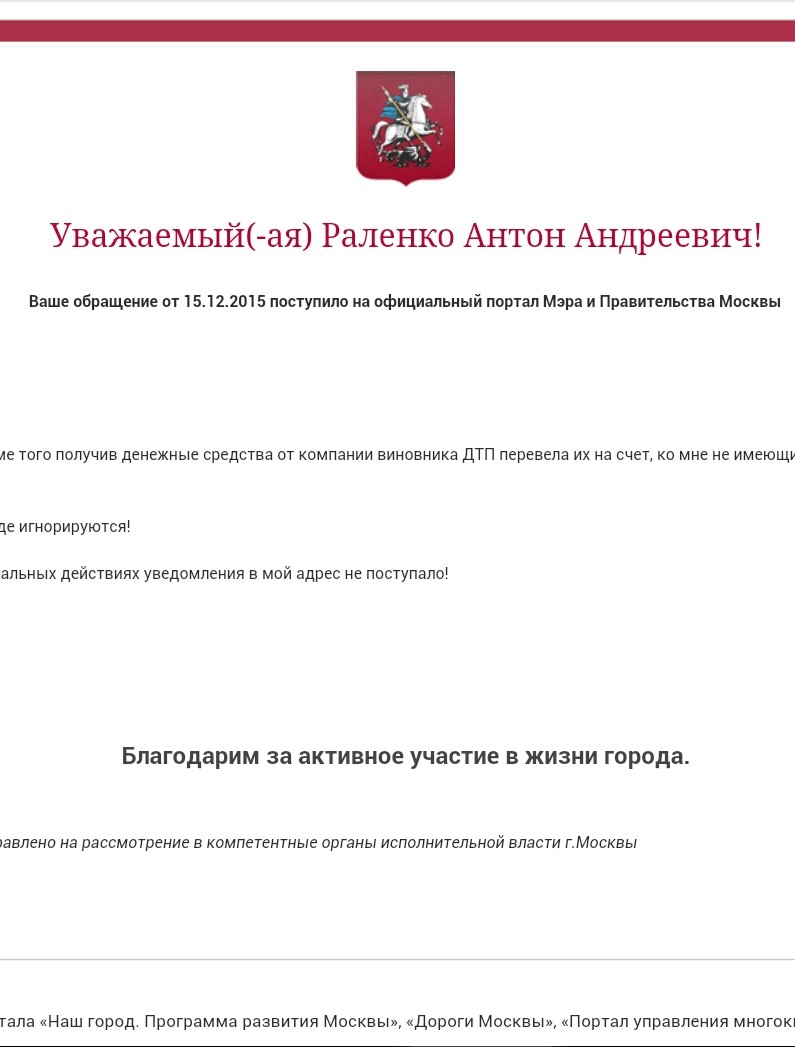 Уведомление Администрации Президента России о получении обращения в связи с вероятными противоправными действиями со стороны руководства страховой компании «АО СГ УралСиб» , содержащее требование привлечения последних к юридической ответственности вплоть до уголовной.Уведомление правительства Российской Федерации о получении обращения в связи с вероятными противоправными действиями со стороны руководства страховой компании «АО СГ УралСиб» , содержащее требование привлечения последних к юридической ответственности вплоть до уголовной.Уведомление прокуратуры города Москвы о получении обращения в связи с вероятными противоправными действиями со стороны руководства страховой компании «АО СГ УралСиб» , содержащее требование привлечения последних к юридической ответственности вплоть до уголовной.Уведомление Центрального Банка Российской Федерации о получении обращения в связи с вероятными противоправными действиями со стороны руководства страховой компании «АО СГ УралСиб» , содержащее требование привлечения последних к юридической ответственности вплоть до уголовной.Уведомление правительства Москвы о получении обращения в связи с вероятными противоправными действиями со стороны руководства страховой компании «АО СГ УралСиб» , содержащее требование привлечения последних к юридической ответственности вплоть до уголовной.Информационное письмо (от 14 12 2015) юридического характера Администрации Президента России о направлении в МВД ранее полученного обращения в связи с вероятными противоправными действиями со стороны руководства страховой компании «АО СГ УралСиб» , содержащее требование привлечения последних к юридической ответственности вплоть до уголовной.Информационное письмо юридического характера ГУ МВД России по Москве о направлении в УВД СВАО Москвы ранее полученного обращения в связи с вероятными противоправными действиями со стороны руководства страховой компании «АО СГ УралСиб» , содержащее требование привлечения последних к юридической ответственности вплоть до уголовной.Информационное письмо юридического характера Администрации Президента России о направлении в МВД ранее полученного обращения в связи с вероятными противоправными действиями со стороны руководства страховой компании «АО СГ УралСиб» , содержащее требование привлечения последних к юридической ответственности вплоть до уголовной.Информационное письмо юридического характера ГУ МВД России по Москве о рассмотрении и передаче по подведомственности обращения по поводу вероятного мошенничества должностных лиц руководства страховой компании «АО СГ УралСиб» , содержащее требование привлечения их к юридической ответственности вплоть до уголовной.Юридический документ районной прокуратуры о передаче в ОМВД по району Коньково города Москвы обращения связанного с вероятным мошенничеством руководства страховой компании АО «СГ «Уралсиб» Обращение содержало также требование привлечение к юридической ответственности руководство АО «СГ «Уралсиб»